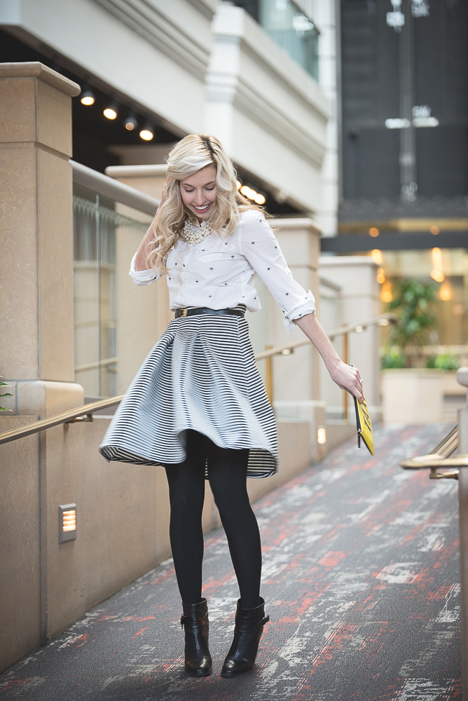Shirt: old, Old Navy (similar), Skirt: Charlotte Russe (exact, but red), Bag: Kate Spade (exact), Boots: old, Kate Spade (exact), Tights: Spanx (exact), Belt: old, Michael Kors (similar), Necklace: Forever 21 (similar)