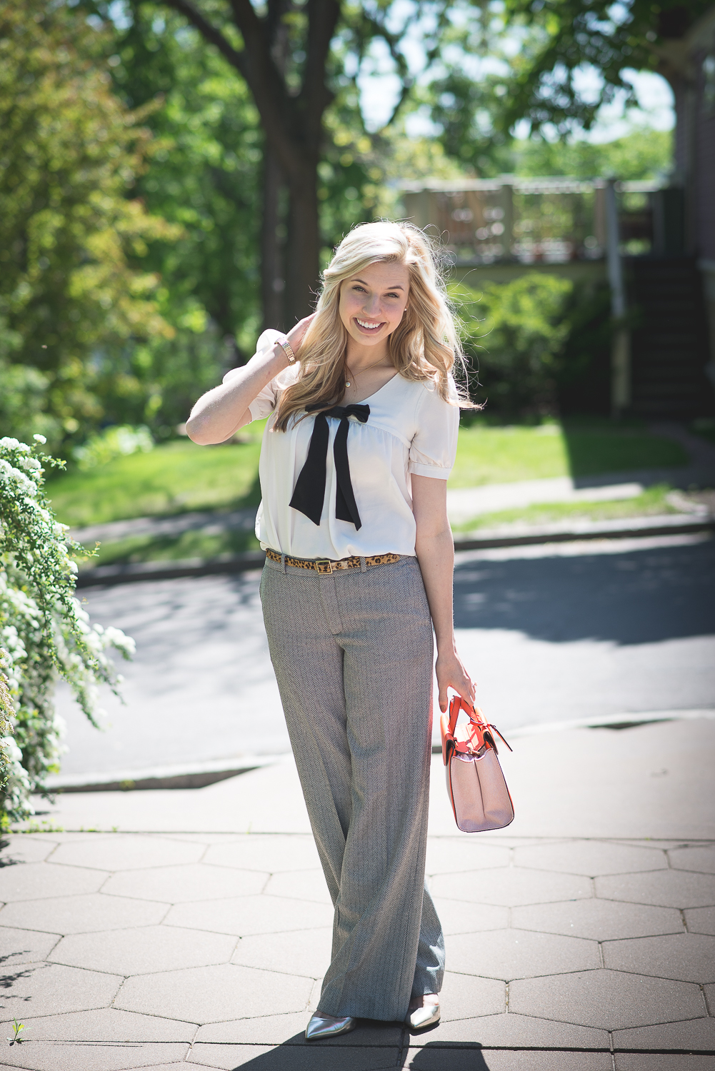 Jacket: old, Burberry (similar), Top: old, Kristin Davis (similar), Pants: Banana Republic (exact), Belt: old, Merona, Target (similar), Shoes: old, J.Crew (similar), Bag: old, Saturday kate spade (similar), Watch: old, Merona, Target (similar), Necklace: gift, Spartina (exact)